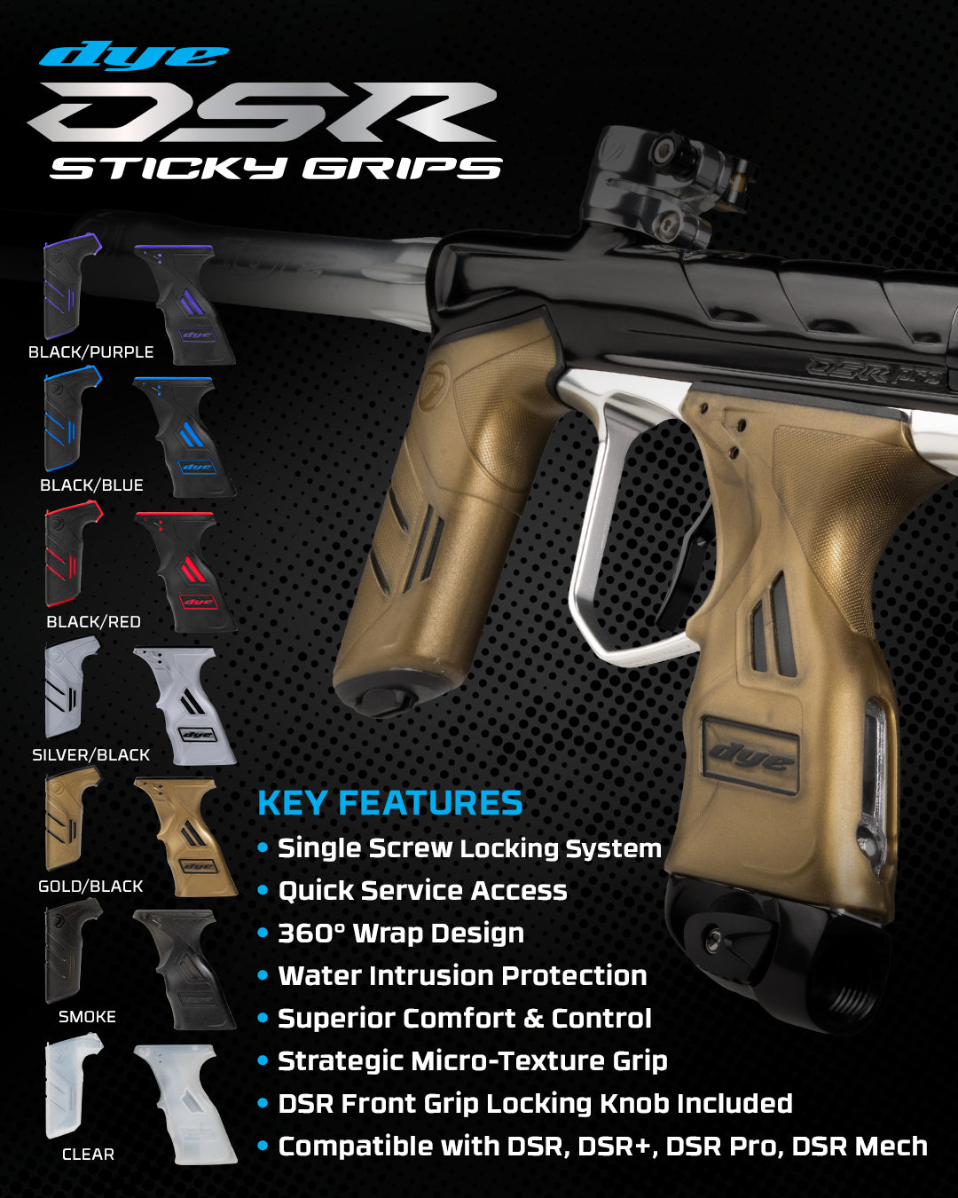 Built on the legacy of the legendary DYE Sticky Grip, the DSR Sticky Grips deliver enhanced comfort, control, and serviceability for the DSR platform. The updated design features a single screw locking system that ensures a secure, rock-solid fit while allowing quick and easy removal for maintenance.